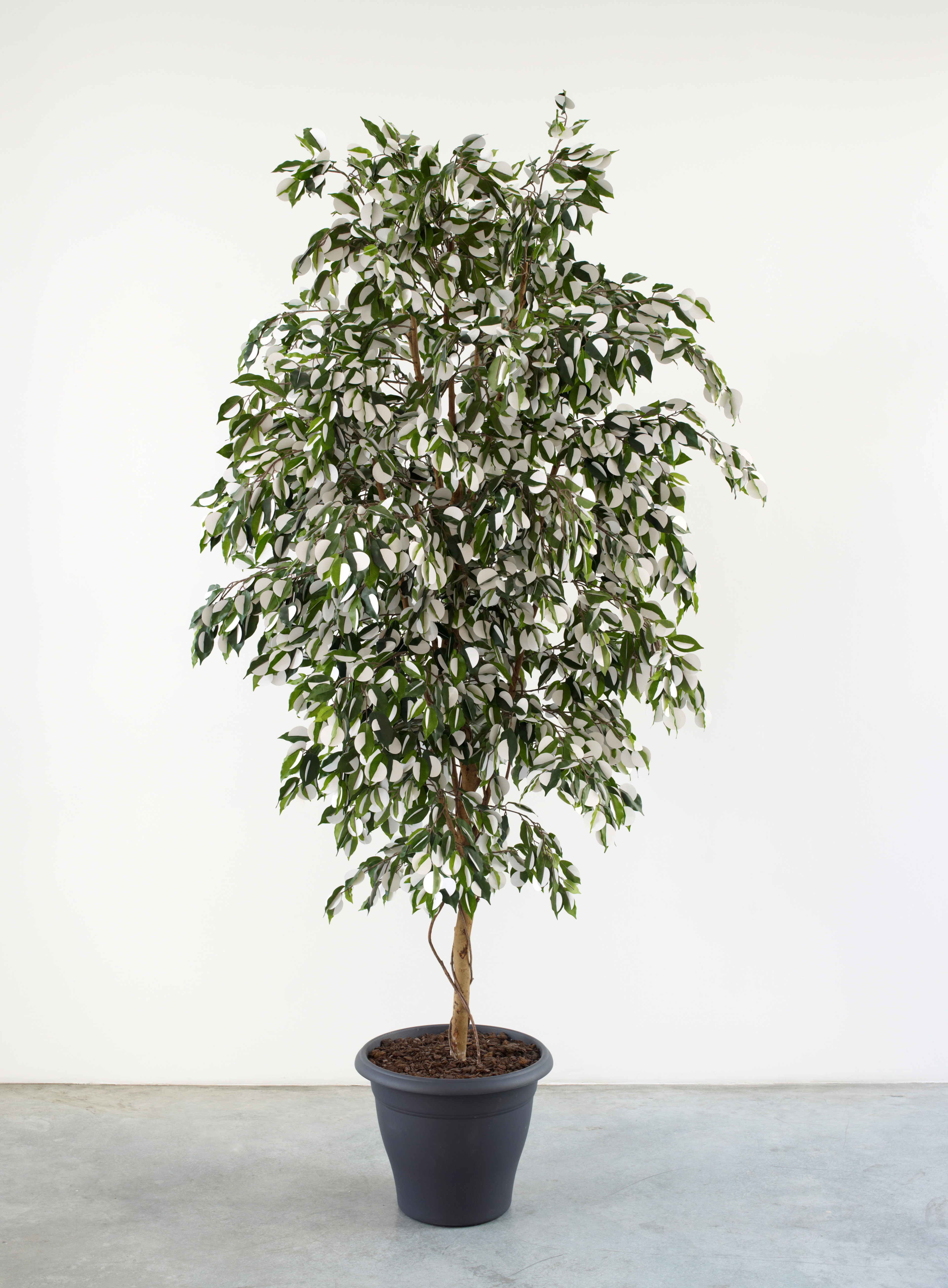 Tree, silk leaves and plastic branches, paper discs, plastic pot, bark chips