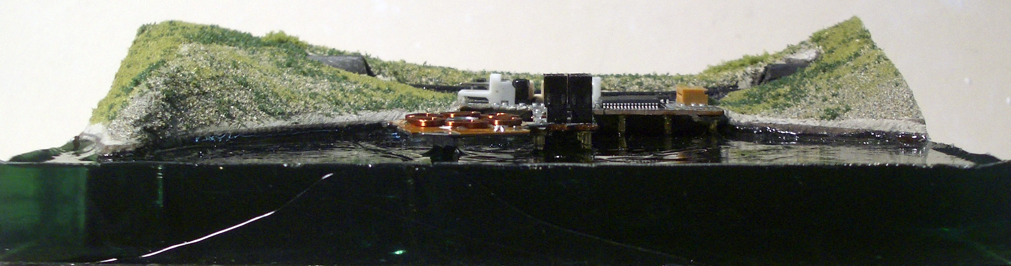 Polyester resin, cardboard, Slem metal stucco, Soft Plus, Stabilio Ohpen Universal, nylon cable ties, brass, printed computer circuits, cyanoacrylic glue, Lechleroid enamel, polyurethane sponge, on medium-density fibreboard